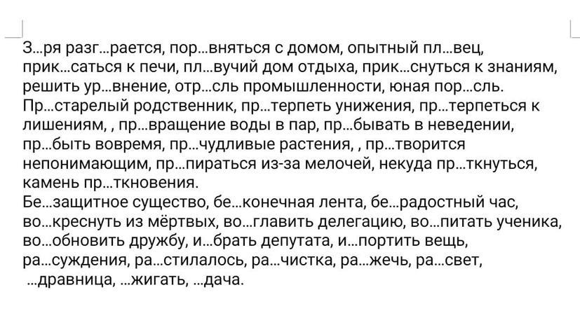 Беззащитное существо, бесконечная лента, безрадостный час, воскреснуть из мертвых, возглавить делегацию, воспитать ученика, возобновить дружбу, избрать депутата, испортить вещь, рассуждения, расстилалось, расчистка, разжечь, рассвет, здравница, сжигать, сдача.