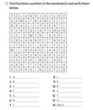 2)find fourteen countries in the wordserch and write them below 1)a____. 2)b___ 3)c____. 4)f_____ 5)g______ 6)h___. 7)i______ 8)j____. 9)p_______. 10)r_____. 11)s_____. 12)t____ 13)y_____. 14)the y
