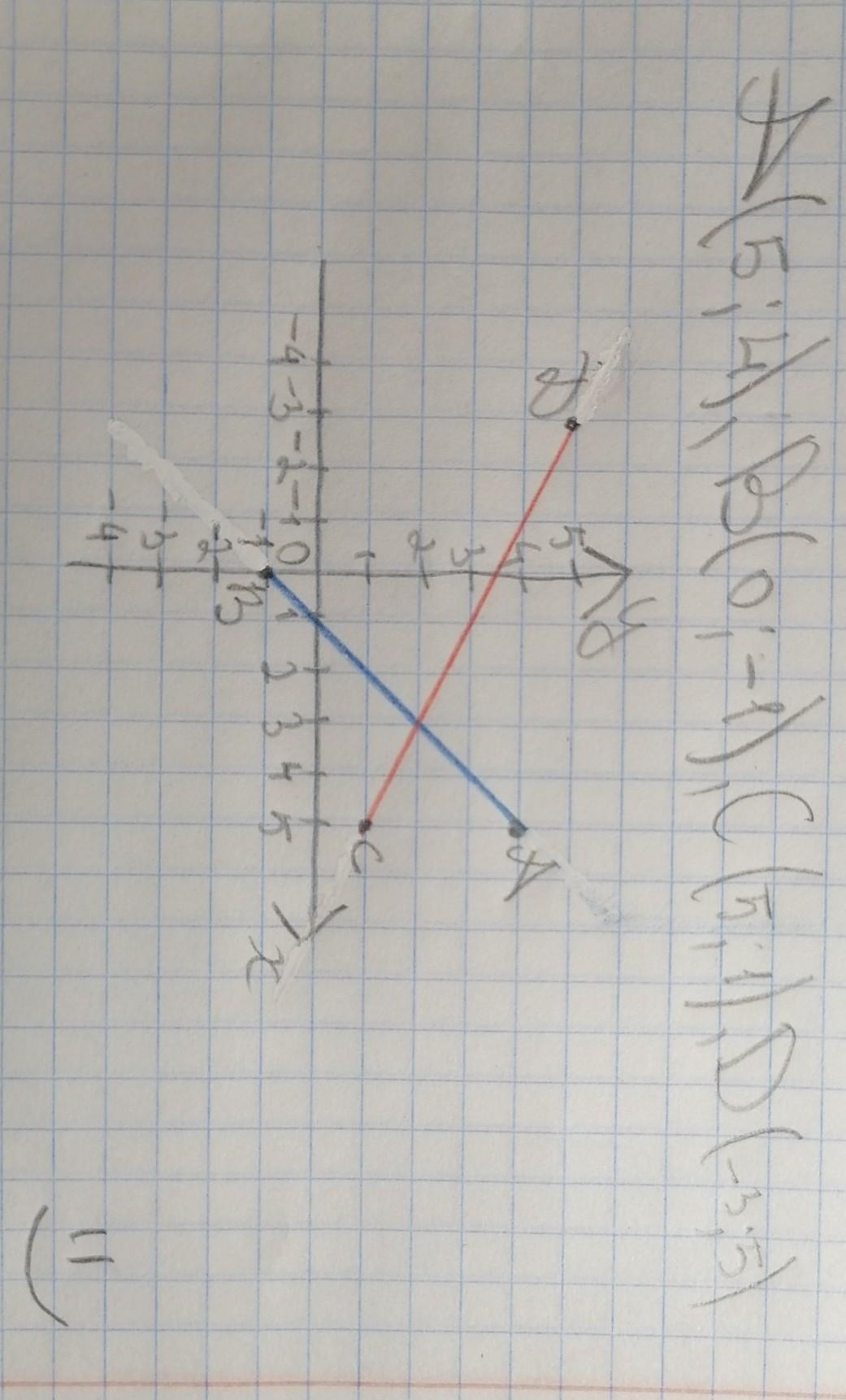 A (5;4), B(0;-1), C (5;1), D (-3;5). Постройте в координатной плоскости прямые AB и CD , укажите координаты их точки