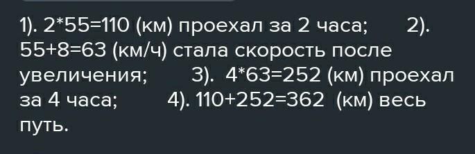 1).2*55=110(км)проехал за 2 часа; 2)55+8=63(км/ч) стала скорость после увелечения; 3). 4*63=252(км) проехал за 4 часа; 4). 110+252=362(км) весь путь.