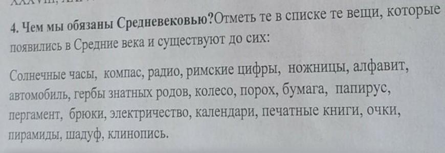 Компас, римские цифры, ножницы, алфавит, автомобиль, порох, бумага, пергамент, брюки, электричество, календари, печатные книги, очки.