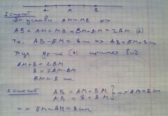 4. Точка M лежит на лучах AB и BA и равноудалена от точек А и В. Найдите расстояние от M до В, ес- ли это расстояние на 8 см меньше, чем расстояние от А до В