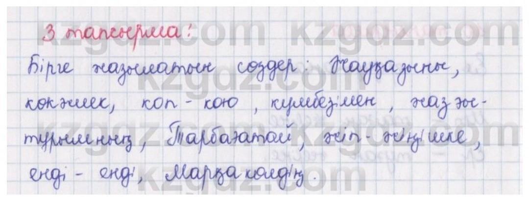 3-тапсырма. Мәтінді оқып, мазмұнын түсіндіріп айт. Бірге және бөлек жа- зылған сөздерге көңіл бөл. Марқаның жағасы ерте кеуіп, ерте көктеді. Жауқазыны қарды жарып шыға беретін тау бөктерінің былтырғыдан қалған күреңсесі күлтеленіп, қаулай тебіндеп келе жатқан көкпен араласып, ала- шабырланып жатыр. Тау ішінде көкжиек жақын болады. Тауда тұрғанда аспан да аласа көрінеді. Сол көктемгі көкжиек - қоп-қою жалқынды сағым іркіліп барып, әлгі көк күмбезімен көмкерілген. Жазғытұрымның кірбіңсіз ашық аспаны мөлдіреп, көлде көрініс беріп тұр. Кілкіген жұқалаң мұнар арасынан оқшау көрініп, мұнда- мұндалап аппақ болып жататын Тарбағатай шың-құздарын ұзын- нан-ұзақ созылған жіп-жіңішке ақ бұлт екіге бөліп, аспан тауына ұқсайтын. Енді-енді бүршік атып, көктемнің шуағына алақанын жая бастаған орман соңғы нөсерден жаңа ғана ес жиып бусанады. Көктемгі ауада сарай ашар жағымды саумал иісі бар. Сымпылдай ұшып келген бір топ шүрегей Марқакөлдің айдынын төсiмен тіл- гілей қонды да, мамырлап жүзе жөнелді. (О. Бөкей )