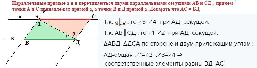 паралельні прямі а і бперетинаються двома паралельними січними АВ і СД причому точки А і С належать прямій а,а точки В і Д прямій б.Доведіть що АС=БД