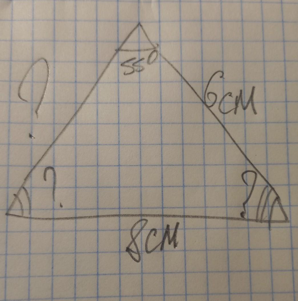 Ну смотри, противоположная сторона где 6см, тоже будет ровна 6см. И так как этот угол равнобедренный, у него все углы одинаковые, так как один угол 550(это я так увидела), то все углы будут 550.