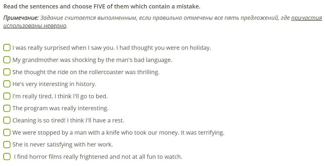 во втором будет shocked,в четвертом interested,в седьмом tiring,в девятом satisfied,в десятом frightening