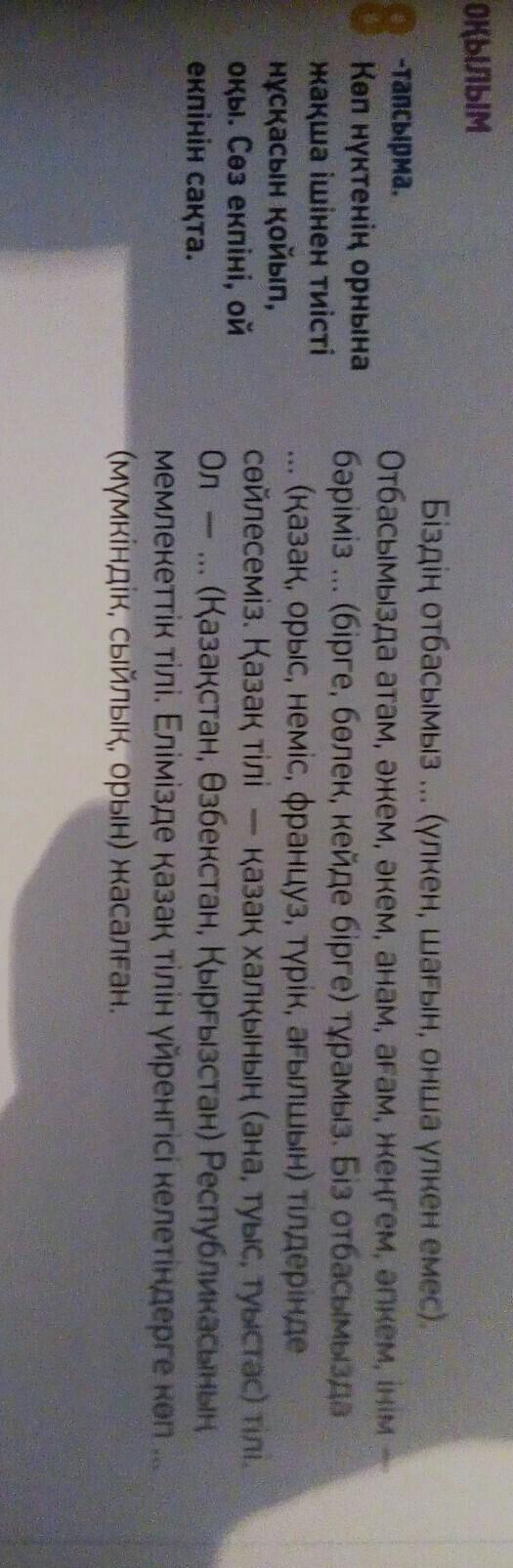 Көп нүктенің орнына жақша ішінен тиісті нұсқасын қойып, оқы. Сөз екпіні, ой екпінін сақта.
