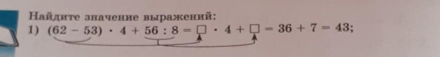 Найдите значение выражений: 1) (62 - 53) • 4 + 56 : 8 = D. 4 + 4 + 0 = 36 + 7 = 43;
