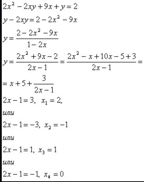 Разделим с остатком числитель на знаменатель: 2x2+9x−2=(2x−1)(x+5)+3. Получается, что y=x+5+32x−1. Число 2x−1 может принимать значения {±1;±3}, что соответствует случаям x=1, x=0, x=2, x=−1. Для каждого такого x выражаем y по формуле, получая четыре решения
