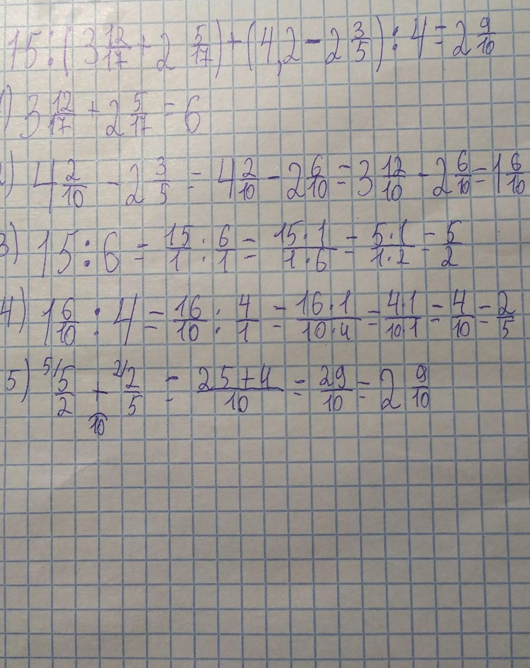 = 15 : 6 + 1,6 : 4 = 2,5 + 0,4 = 2,9