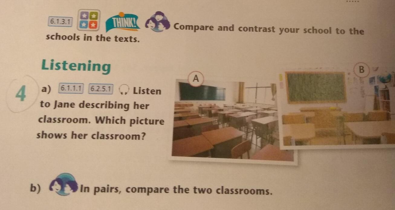 ПОМОГИТЕ ПОЖАЛУЙСТА B Listening A 4 a) 6.1.1.1 6.2.5.1 Listen to Jane describing her classroom. Which picture shows her classroom? b) In pairs, compare the two classrooms.