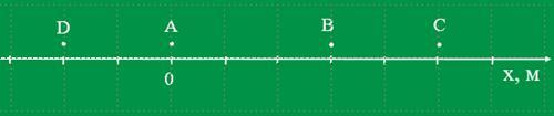 Определи по рисунку проекцию перемещения тела из точки A в точку D, если единичный отрезок на оси равен 7 м.