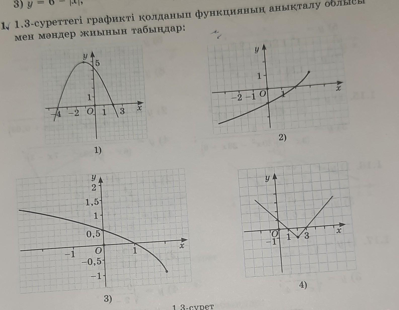D(y)=R, E(y)=(-~ ; 5], 2) D(y)=(-~ ; 3], E(y)=(-~ ; 1], 3) D(y)=(-~ ; 2], E(y)=[-1 ; +~), 4) -2,5 ; 6 (~-это бесконечность)