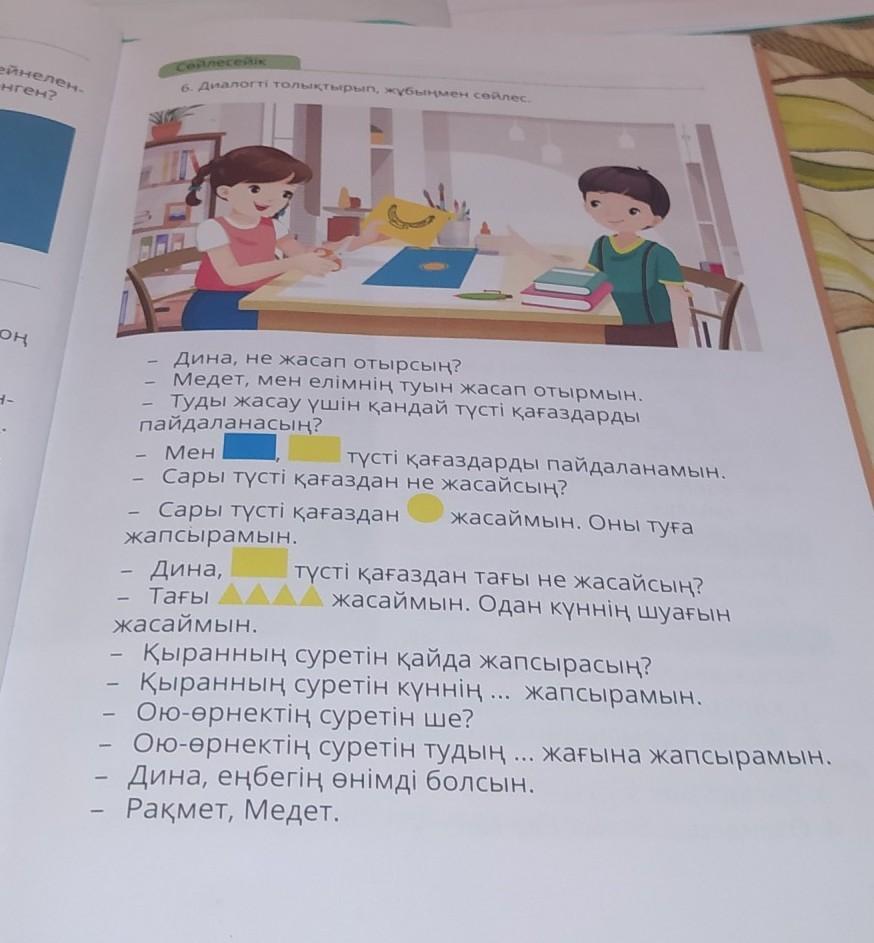 6. Диалогті толықтырып, жұбыңмен сөйлес.