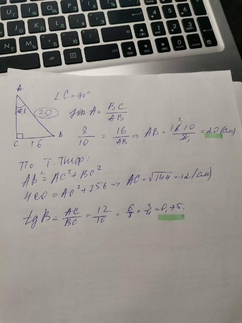 У прямокутному трикутнику ABC(кут С=90°), BC=16 cм, sinA=0,8. Знайдіть гіпотенузу, другий катет та tgB.