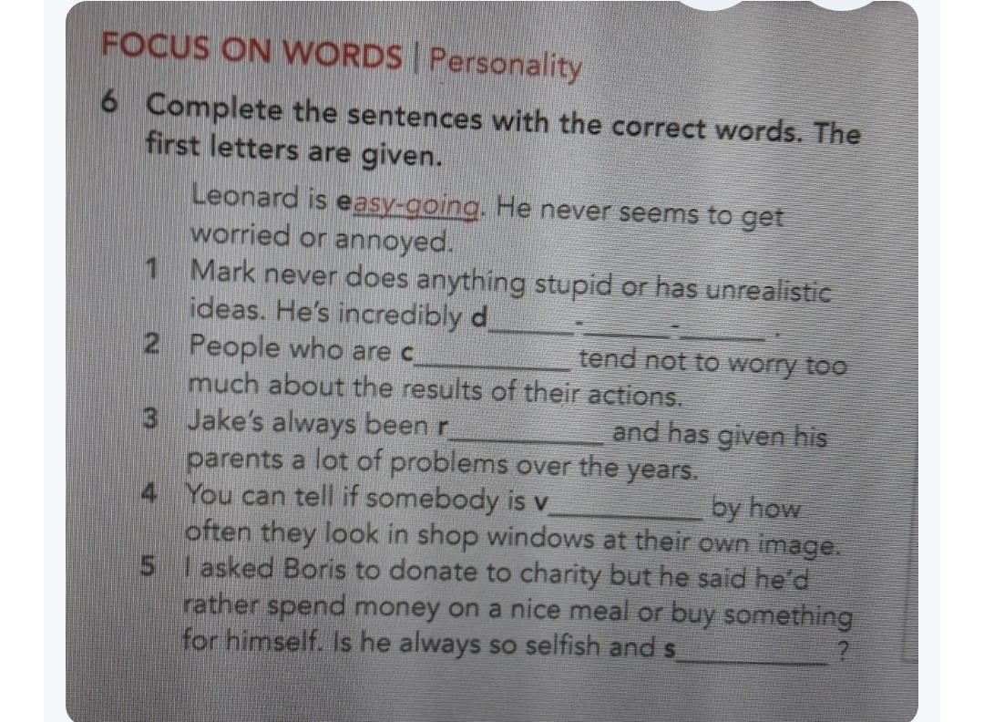 6 Complete the sentences with the correct words. The first letters are given. Leonard is easy-going. He never seems to get worried or annoyed. 1 Mark never does anything stupid or has unrealistic ideas. He's incredibly d 2 People who are c tend not to worry too much about the results of their actions. 3 Jake's always been r and has given his parents a lot of problems over the years. 4 You can tell if somebody is v by how often they look in shop windows at their own image. 5 I asked Boris to donate to charity but he said he'd rather spend money on a nice meal or buy something for himself. Is he always so selfish and s ?