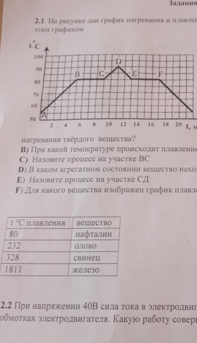 А) Сколько времени длился процесс нагревания твердого вещества?B) При какой температуре происходит плавление тела?C) Назовите процесс на участке ВСD) В каком агрегатном состоянии вещество находится в точке С? E) Назовите процесс на участке СДF) Для какого вещества изображен график плавления и кристаллизации? (смотрите таблицу)