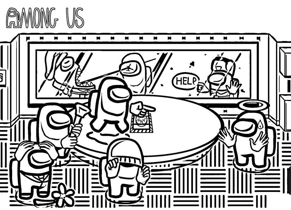 In the picture we can see a spacecraft from the computer game "Among Us". In the picture there are five among us players, they are standing around the table and discussing who is an imposter and whom they will kick