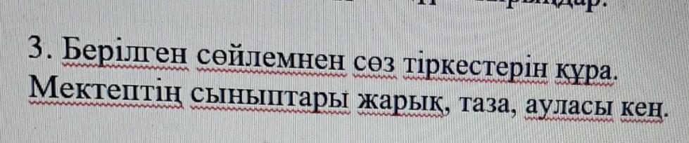 Берілген сойлемнен сөз тіркестерін кұра . Мектептің сыныптары жарык, таза, ауласы кең