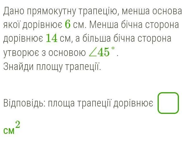 Площадь фигуры равна: 6 · 14 + 0,5 · 14² = 84 + 98 = 182 (см²)