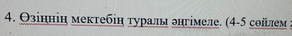 Менің мектебім өте үлкен. Мұнда асхана, кітапхана, спортзал және де көптеген сыныптар бар. Ал, мектептің сыртында түрлі гүлдер мен ағаштар көздің жауын алады. Мен мектебімді жақсы көремін және мақтан тұтамын.