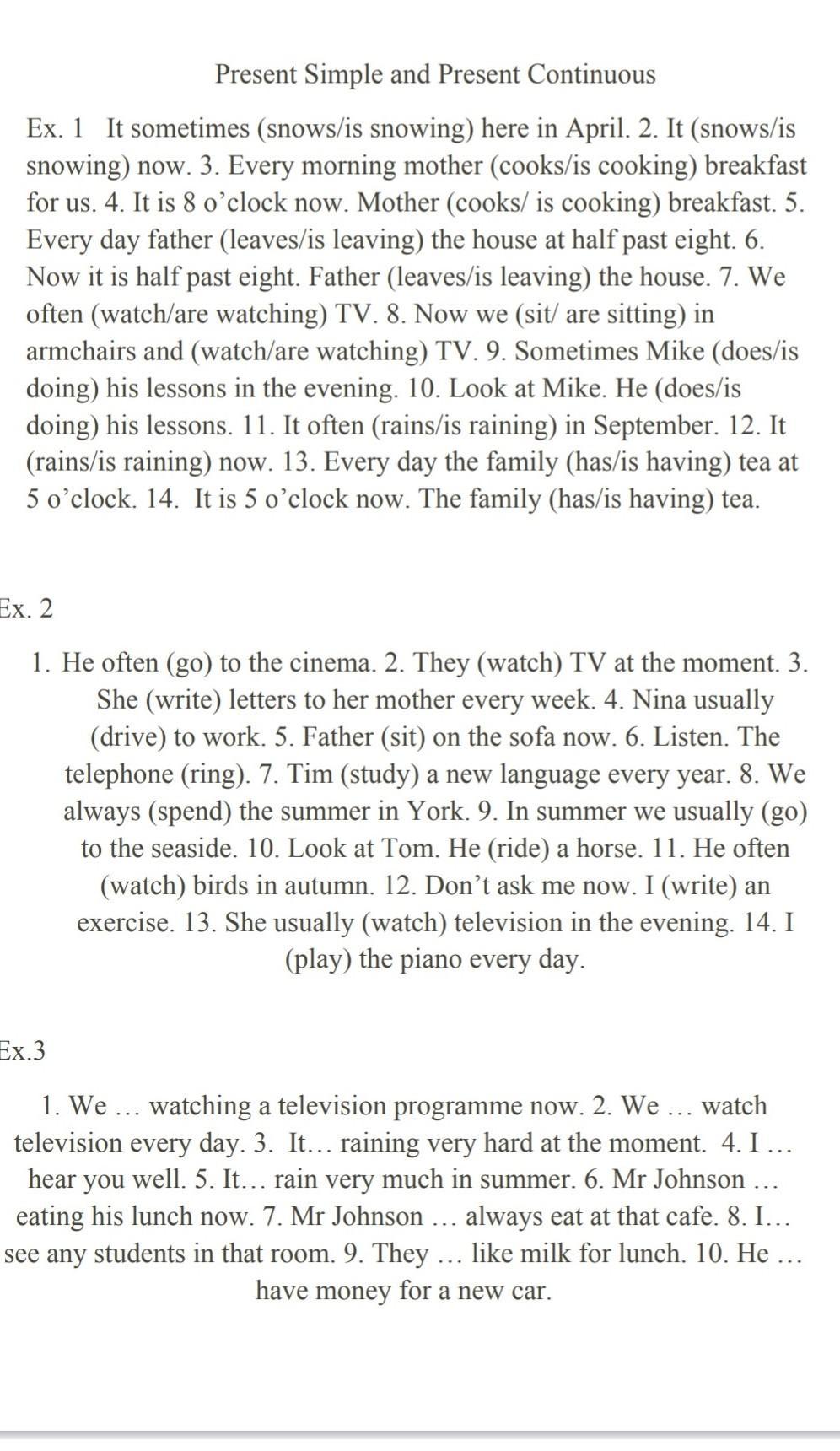 1.snows 2.is snowing 3.cooks 4.is cooking 5.leaves 6.is leaving 7.watch 8.are sitting 9.does 10.is doing 11.rains 12.is raining 13.has 14. Is having