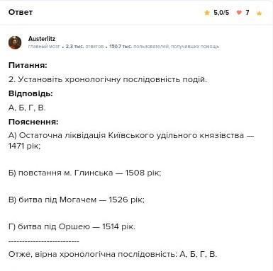 2. Установіть хронологічну послідовність подій. Остаточна ліквідація Київського удільного князівства У повстання М. Глинського битва під Могачем - битва під Оршею.