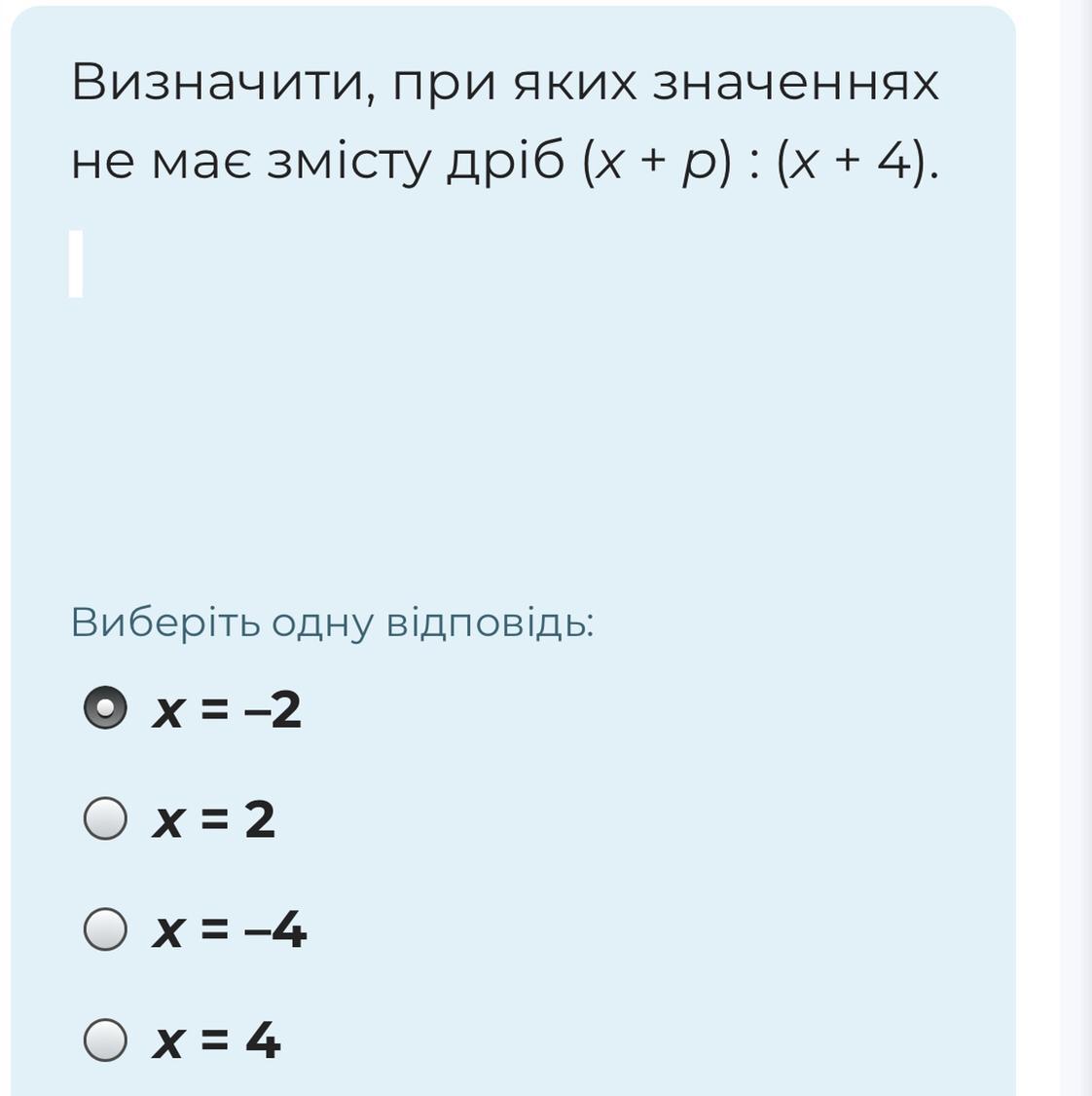 Відповідь: не має змісту дріб, у якому знаменник перетворюється на нуль, тобто при х= -4