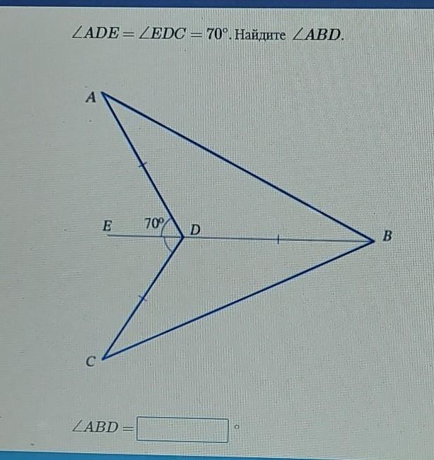 Заметим, что поскольку AD = DE, ΔABD равнобедренный ⇒ ∠DAB = ∠ABD. ∠ADB = 180°-∠ADE = 180°-70°=110°. ∠BAD + ∠ABD + ∠ADB = 2∠ABD + 110° = 180° ⇒ 2∠ABD = 180°-110° = 70° ⇒ ∠ABD = 35°