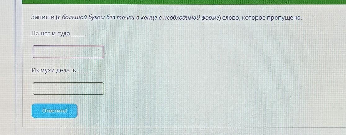 Запиши (с большой буквы без точки в конце в необходимой форме) слово, которое пропущено. На нет и суда Из мухи делать Ответить,