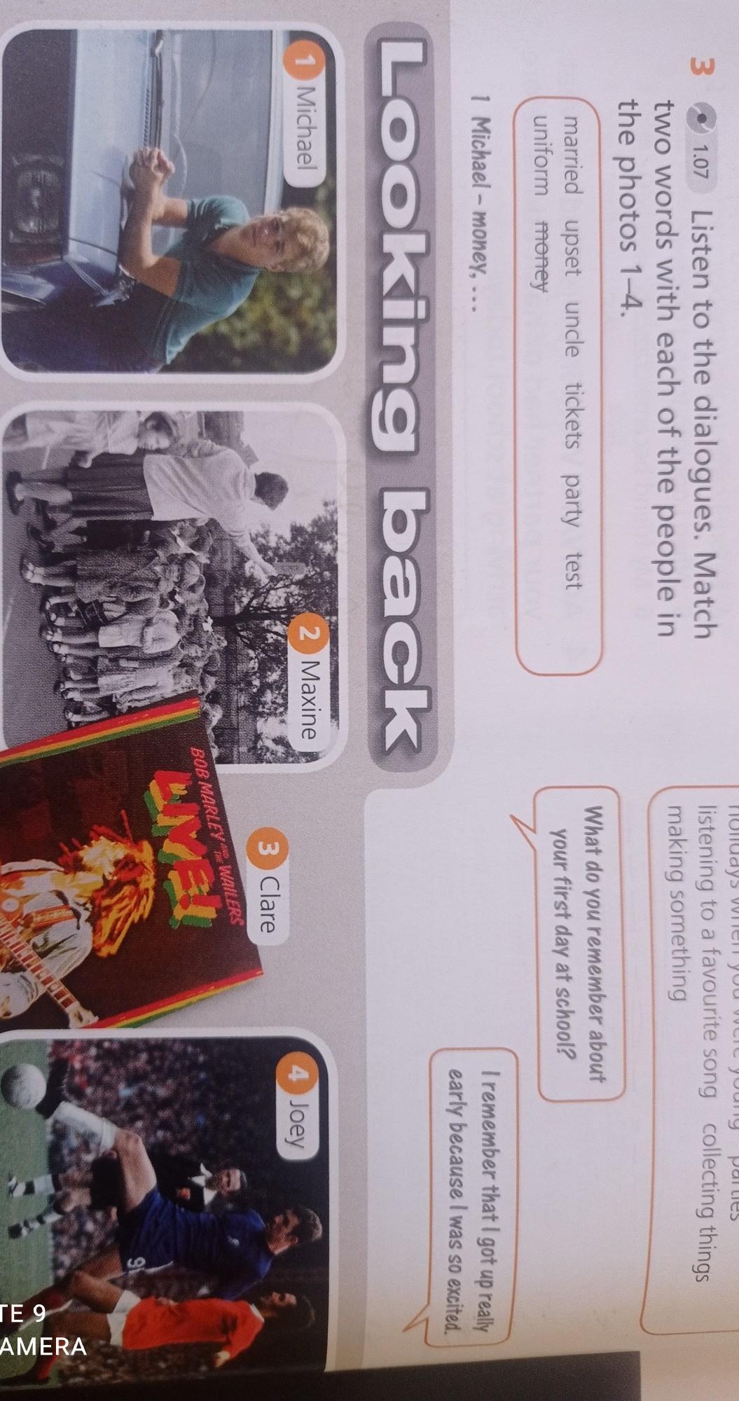 3 • 1.07 Listen to the dialogues. Match two words with each of the people in the photos 1-4. married upset uncle tickets party test uniform money 1 Michael – money, ...