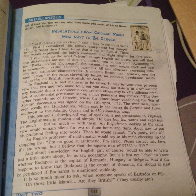 Если ты посмотришь слово "умный" в любом английском словаре, ты увидишь? что словари устарели и вводят вас в заблуждение по этому вопросу.Согласно "Карманному Оксфордскому Словарю", например, слово означает быстрый и аккуратный в движении ... умелый, талантливый, гениальный. Все хорошие прилагательные, выражающие ценные и достойные характеристики. Современные англичане, однако, используют слово умный" в значении: ловкий, хитрый, тайный, скрытый, коварный, подлый, хитрый, ООН-английский, ООН-валлийский.