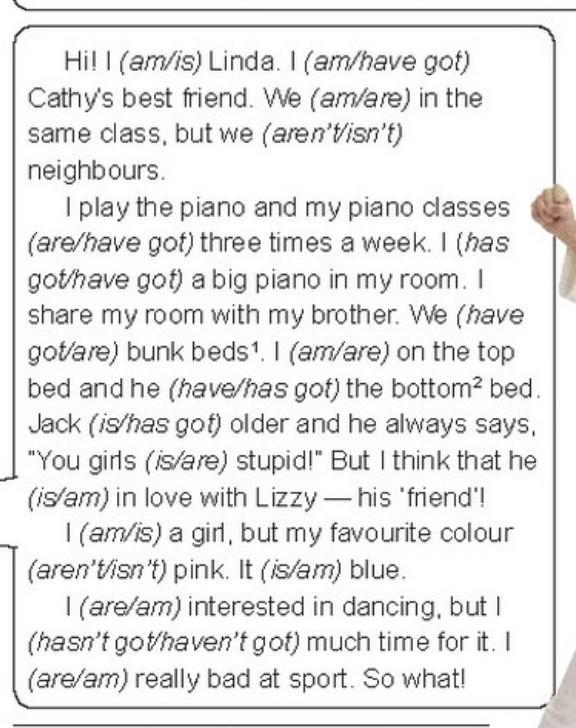 (второй абзац и до конца) are, have got, have got, am, has got, is, are, is, am, isn't, is.