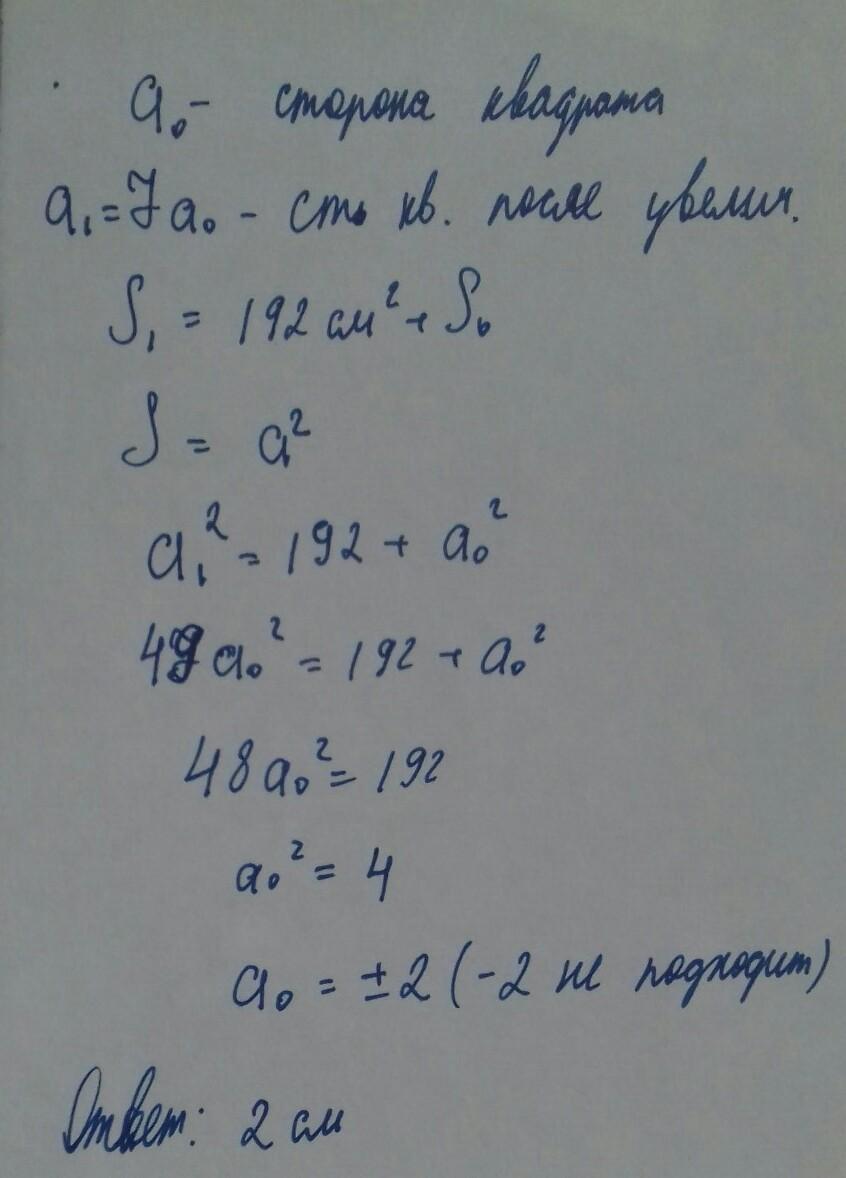 Сторону квадрата увеличили в 7 раз и получили новый квадрат, площадь которого на 192 см2 больше площади данного квадрата. Найди сторону данного квадрата.