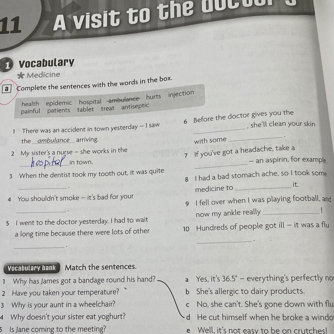 3) painful 4) health 5) patients 6) injection, antiseptic 7) tablet 8) treat 9) hurts 10) epidemic