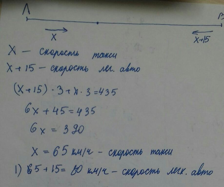 Между домами, в которых живут Леонид и Виктор, лежит прямая дорога длиной 435 км. Друзья договорились встретиться в кафе, расположенном возле этой дороги между их домами. Леонид выехал из дома на маршрутном такси, а Виктор — на легковом автомобиле, скорость которого на 15 км/ч больше, чем скорость маршрутного такси. Известно, что каждый из друзей потратил на дорогу 3 ч. Найди скорость маршрутного такси и скорость легкового автомобиля.