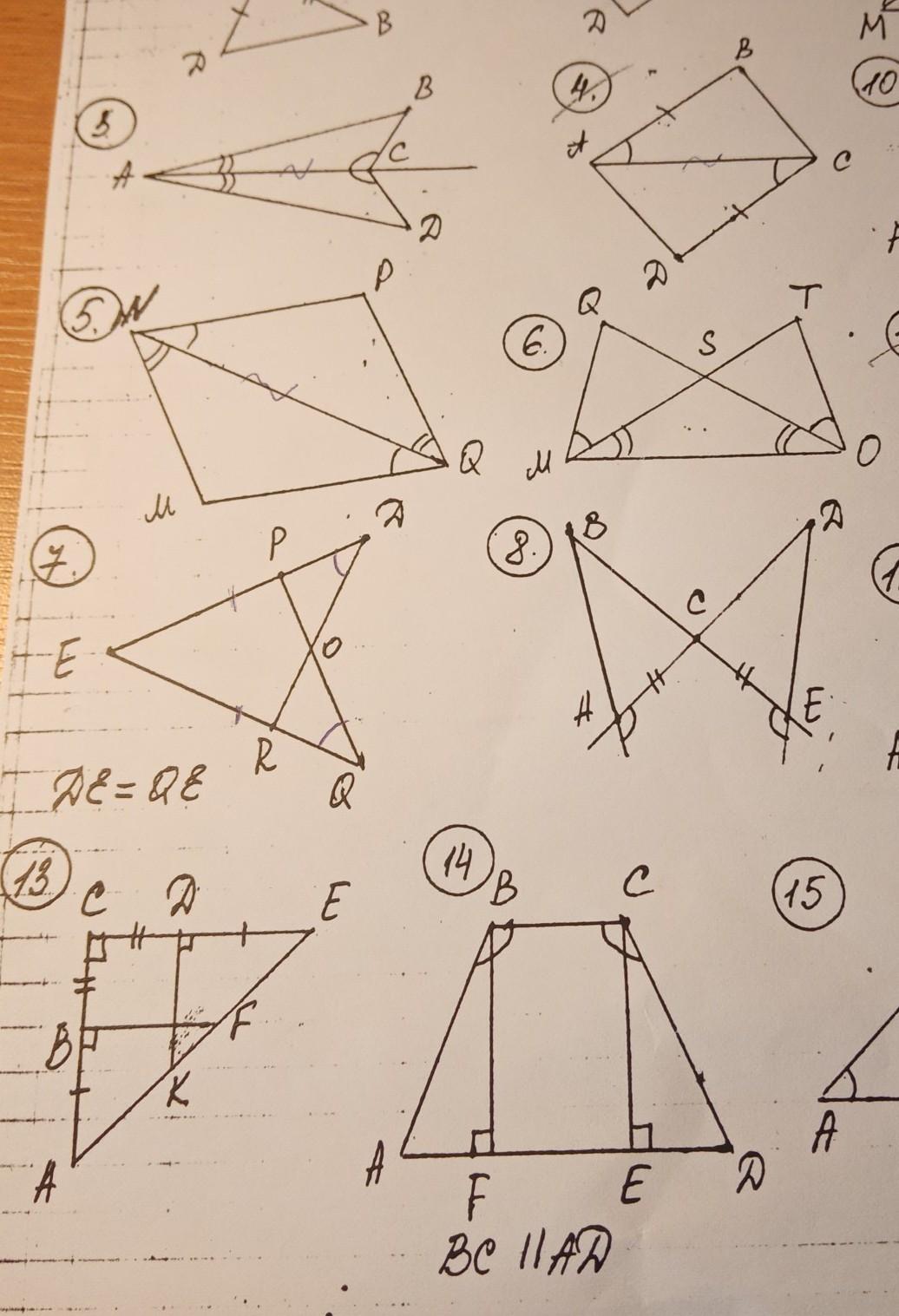 6)Треугольники образуют равнобедренный треугольник ⇒ сторона MS = SO ⇒ ΔQMS = ΔSOT (так как ∠QSM = ∠TSO как вертик. Сторона MS = SO и ∠QMS = ∠SOT) ⇒ MS + ST = OS + SQ ⇒ QO = MT ⇒ ΔMTO = ΔMQO (по 2 сторонам и прилежащим к ним углу)