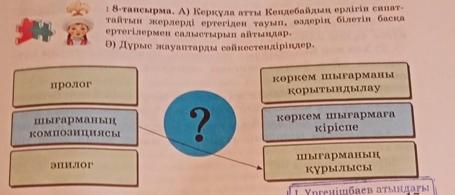: 8-тапсырма. А) Керқұла атты Кендебайдың ерлігін сипат- тайтын жерлерді ертегіден тауып, өздерің білетін басқа ертегілермен салыстырып айтыңдар. Ә) Дұрыс жауаптарды сәйкестендіріңдер. пролог көркем шығарманы қорытындылау шығарманың композициясы ? көркем шығармаға кіріспе эпилог шығарманың құрылысы 2 - 2505 1. Үргенішбаев атындағы 17 орта мектеп кітапханасы ООООООООО ою. Око