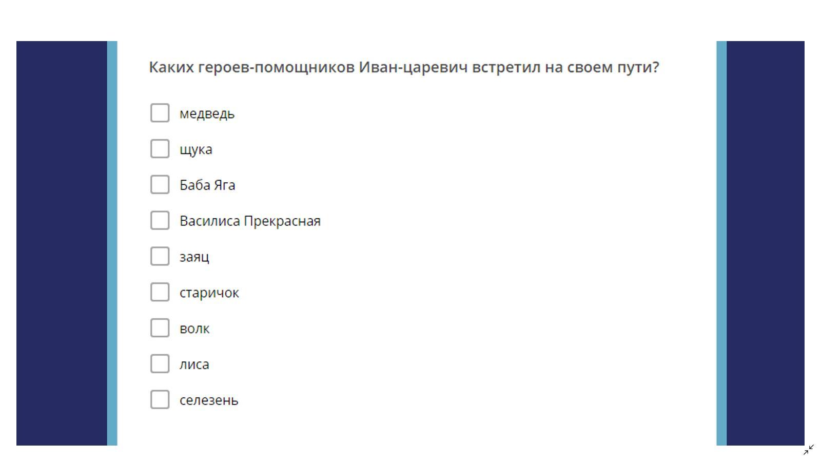 медведь, щука, Баба Яга, заяц, старичок, селезень