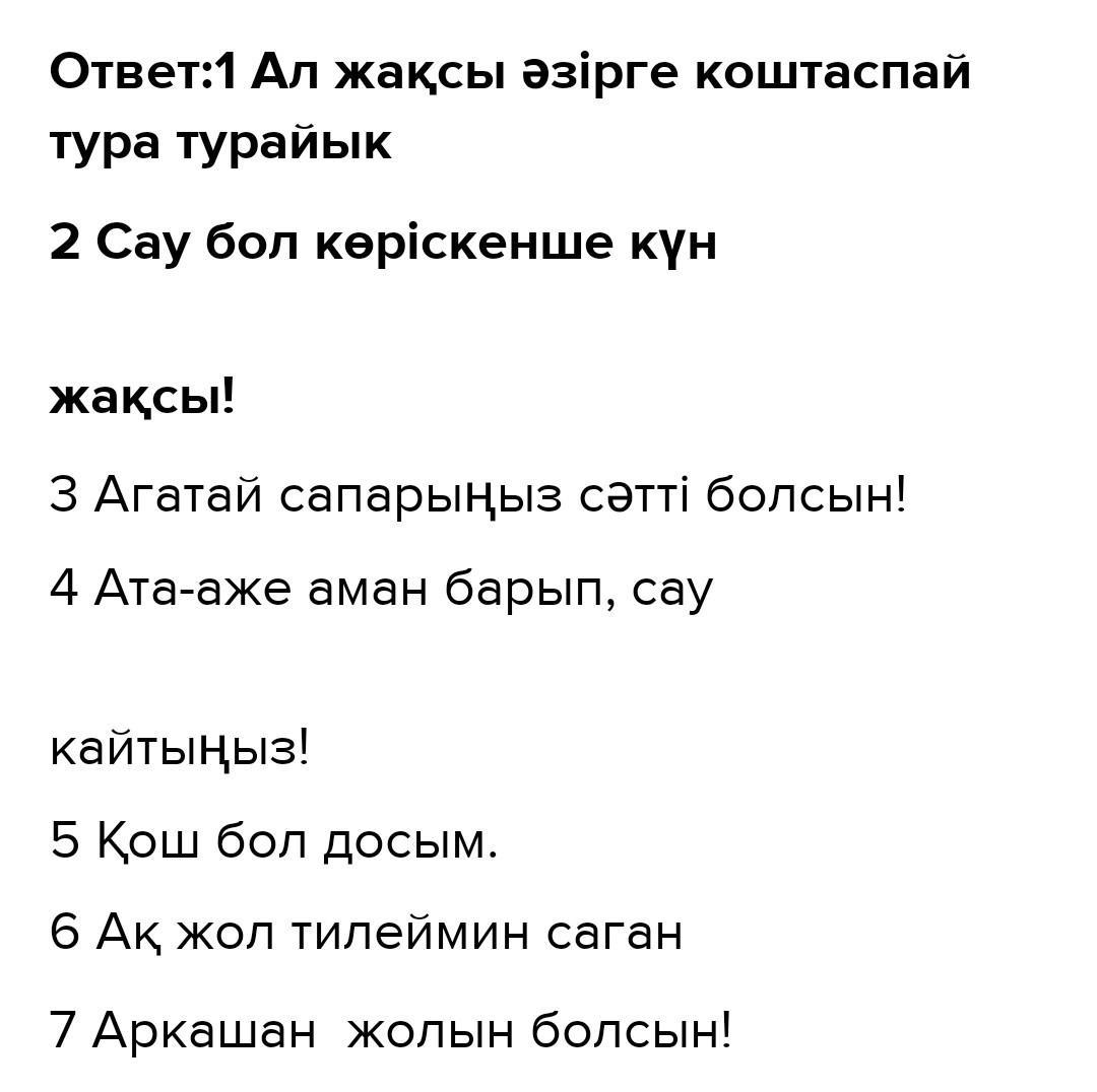 қайшы, кереғар. . Айтылым 7-тапсырма. Төмендегі пікірді сілтеме етіп алып, пікірта . ласка тусіндер. «Өзі туралы ғана айтатын адам тек өзі туралы ғана ойлайды. Ал өзі туралы ғана ойлайтын адам – қанша оқыған адам болса да, мәдениетсіз адаммен тең», — дейді Колумбия университетінің президенті Николас Мюррей Батлер. ЖАЗЫЛЫМ 8-тапсырма. Қоштасу сөздерін белгілі бір жағдайда (үлкен кіші, ер – әйел, құрбылар) қолданылатынын дәлелдейтін сөйлемдер құра. 1. Ал жақсы, әзірше, әзірге. 2. Көріскенше! Көріскенше күн жақсы! 3. Сәт сапар! Сапарыңыз сәтті болсын! 4. Аман барып, сау қайтыңыз! 5.Қош, қош-қош, қайыр қош. 6. Ақ жол, амандық болсын! 7. Жол болсын! Есте сақта! Эмоционалды сөздер адамның сезімін, көзқарасын, көңіл күйдің түрлі иірімдерін білдіріп Tmam Ш