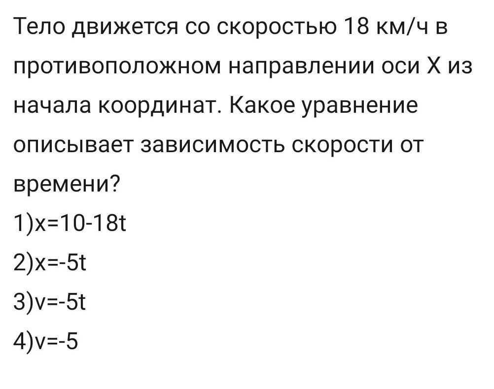 Скорость постоянна, противонаправлена оси ох, поэтому "-", переводим 18 км/ч в СИ получаем. что по модулю скорость равна 5.
