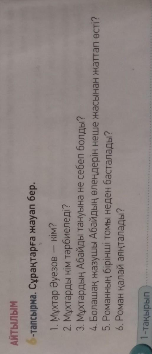 1 Қазақтың ұлы жазушысы.2.Дінасіл тәрбиелеген.3.сабақ берді, араласып отырды.4. Алты жасынан.5.Балалық шағынан .6.Қайтыс болуымен аяқталды