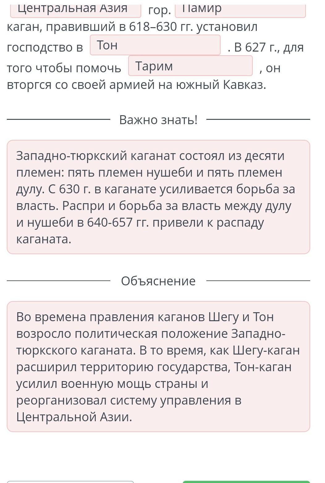 Раннесредневековые государства на территории Казахстана. Урок 2 Вставь в предложения пропущенные слова. И Западно-Тюркский каганат во время правления У кагана расширил территорию на Востоке от на западе до реки Top У каган, правивший в 618-630 гг. установил господство в у в 627 г. для того чтобы помочь он вторгся со своей армией на южный Кавказ. ключевые слова:Алтай,Византия,Тарим,Шагу,Памир,Центральная Азия,Тон.