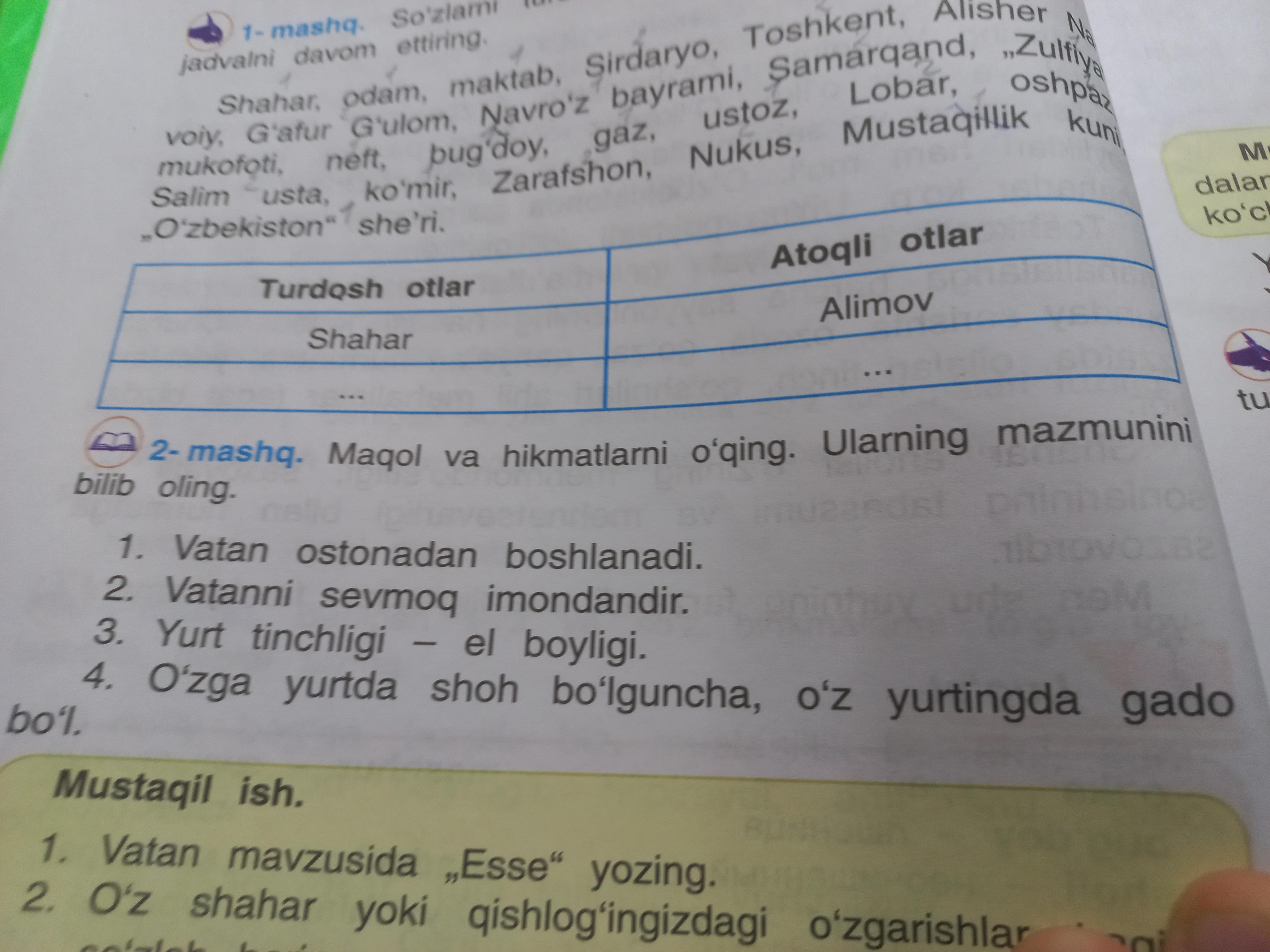 Ответ:1:bu degani vatan õz uyingdan boshlanadi degani. 2:Vatanni qadrlash va uni obod qilish har bir kishining vazifasidir. 3:Agar biz yashab turgan vatan tinch bõlsabundan oliy ne'matbõlmaydi. 4:Õzga yurtda õz yurtingdagidek halovat topa olmaysan