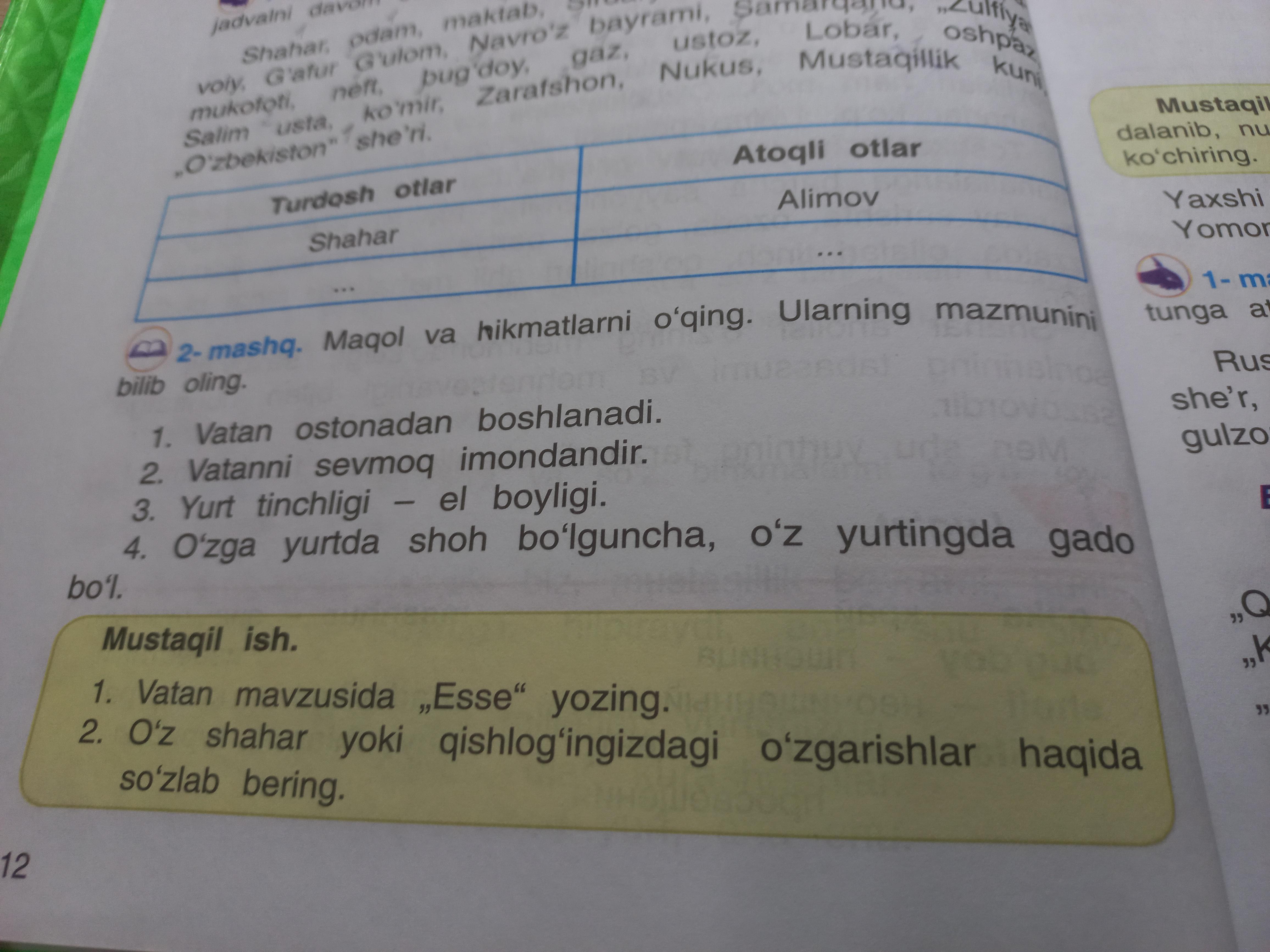 - Vatan ostonadan boshlanadi. (Ya'ni har kim uchun uning birinchi vatani bu uning uyi - oilasidir)