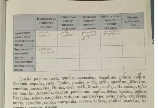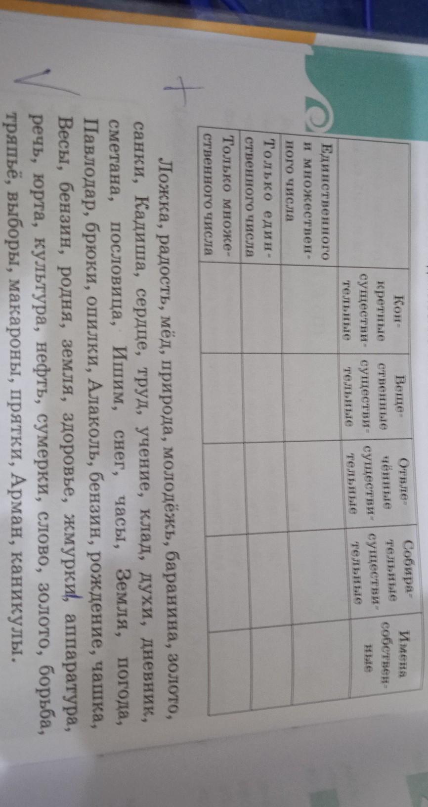 Запиши данные существительные в таблицу. Существительные каких разрядов имеют форму только единственного или только множественного числа? Помогите пожалуйста.Буду очень благодарна.