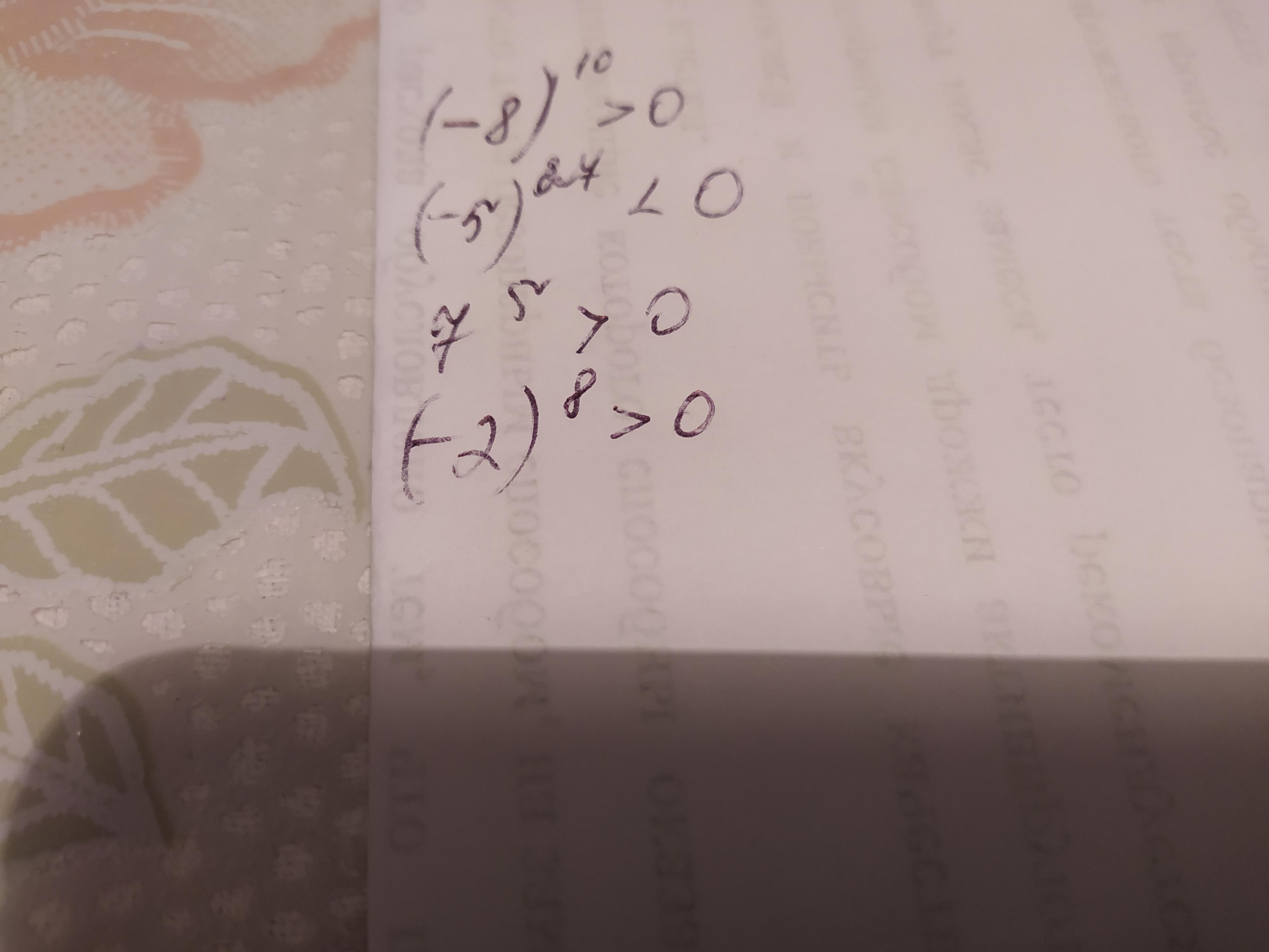 Сравните с нулём значение выражения (ответ зашші в виде неравенства(-8)10(степени) (-5)27(степени) 7 5(степени) -2 8(степени) помогите пожалуйста ✋