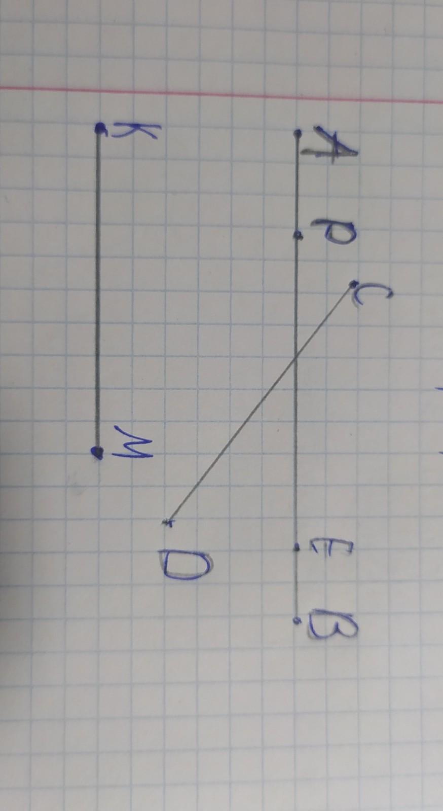 Начертите прямую AB и отрезки CD, KM и PE так, чтобы отрезок CD пересекал прямую AB, отрезок KM не пересекал эту прямую, а отрезок PE лежал на прямой AB