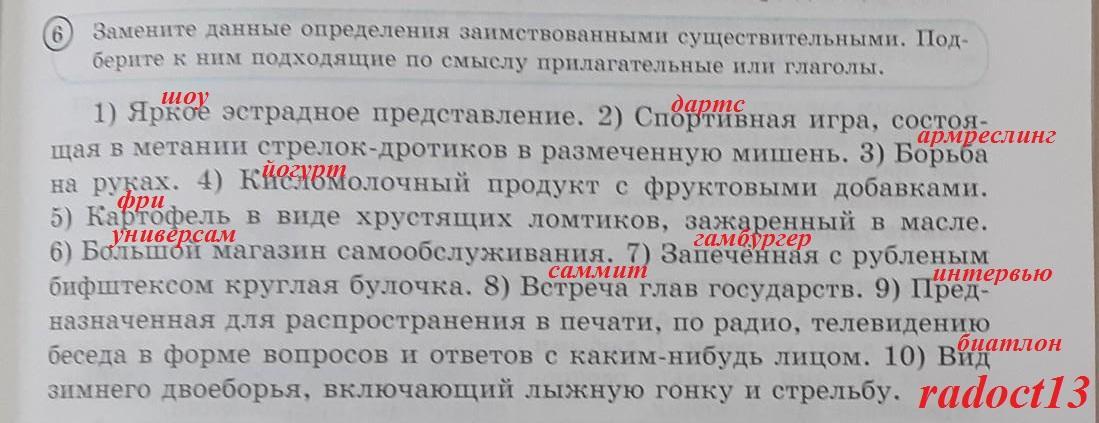 6. Замените данные определение заимстованными существительноми. Подберите к ним подходящие по смыслу прилагательное или глаголы. Помогите!