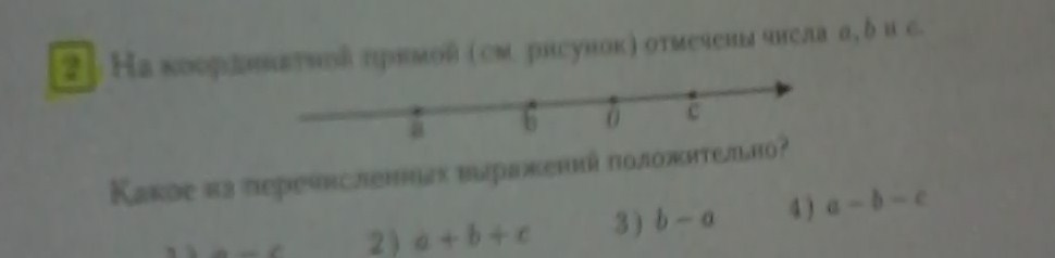 на координатной прямой отмечены числа a b и c. Какое из перечисленных выражений положительно? 1) а-с, 2) а+b+c. 3) b-a. 4) a-b-c